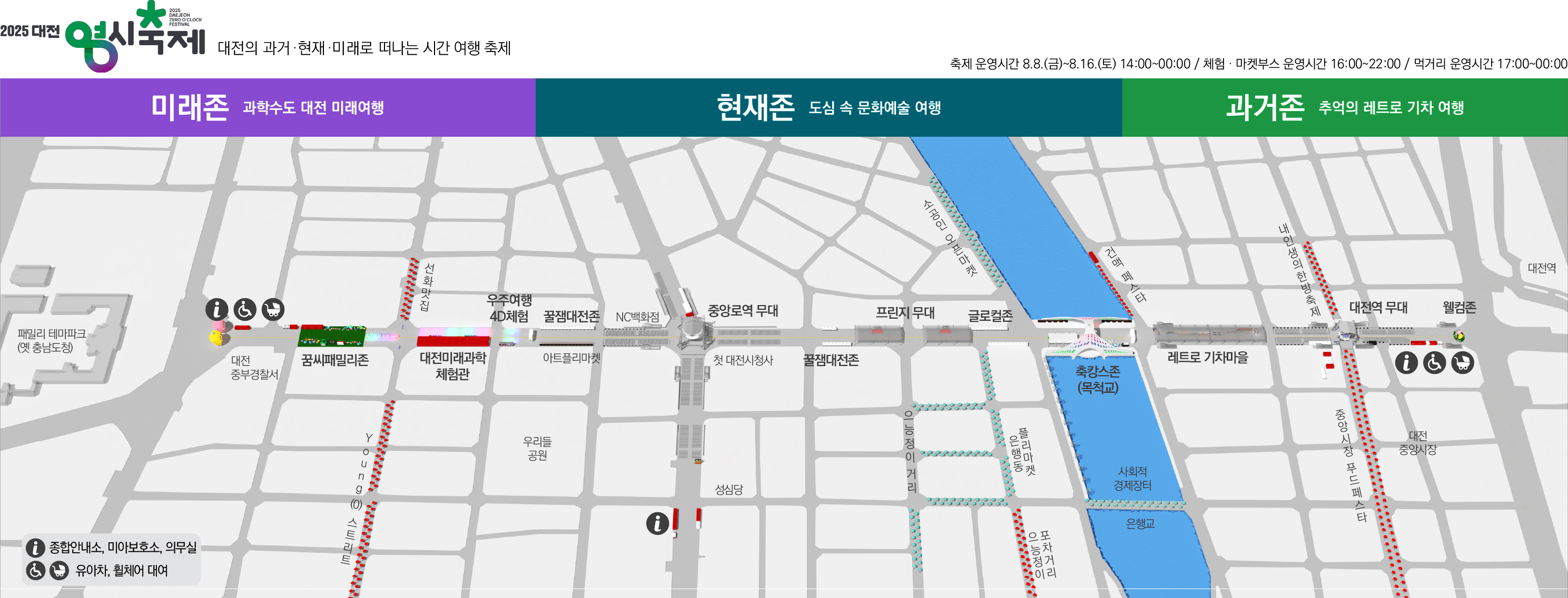 꿀잼대전존, 프린지 무대, 글로컬존, 축캉스존(목척교), 레트로 기차마을, 대전역무대, 웰컴존